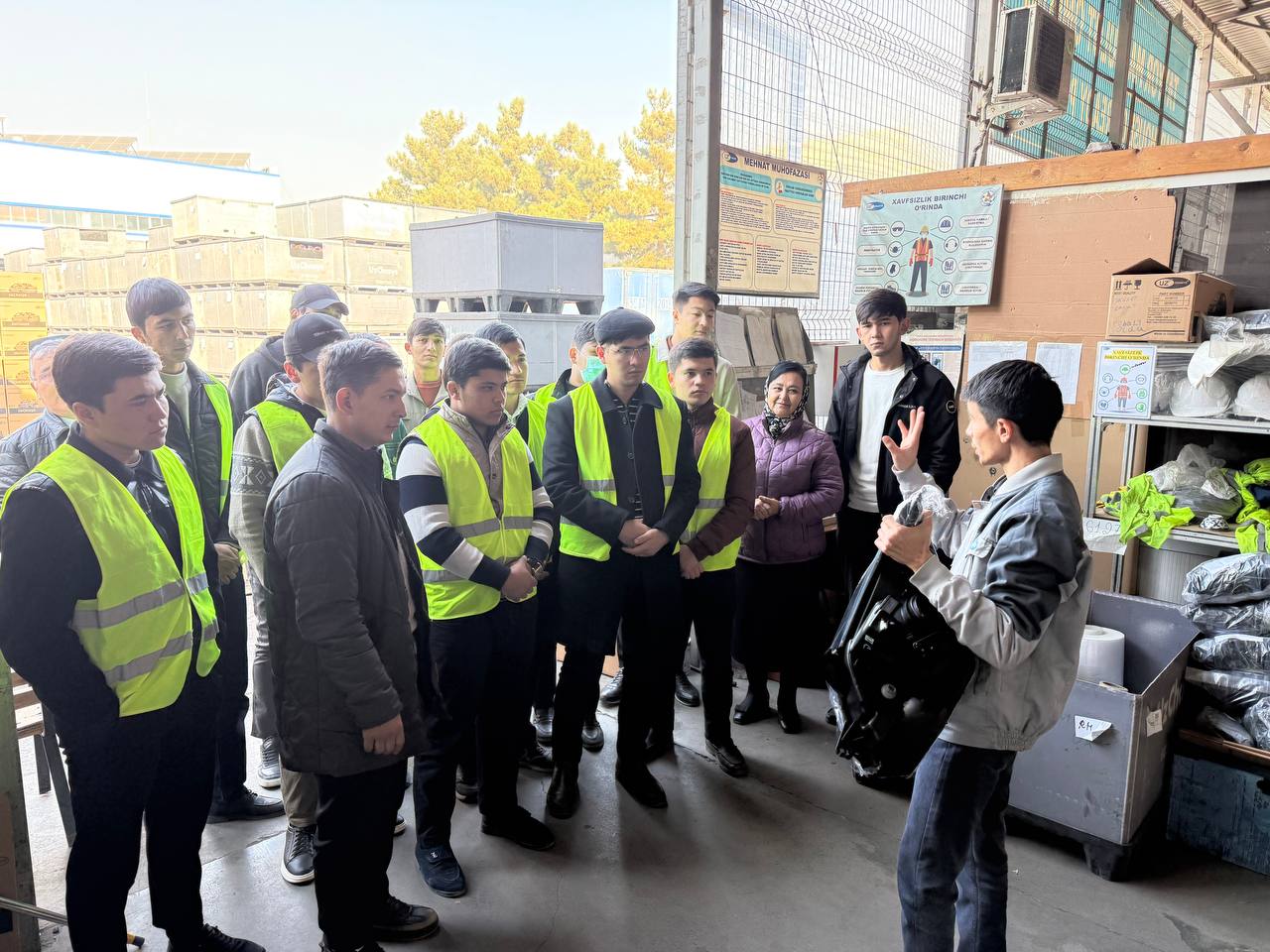 Korxona mutaxassislari talabalarni ishlab chiqarish maydonlariga olib kirib, har bir uskunaning vazifasi, ishlash tartibi va xavfsizlik qoidalari haqida tushuntirish berdi. Talabalar mashina va jihozlarning texnik xususiyatlarini ko‘rish, ularning ishlab chiqarish jarayonidagi o‘rnini o‘rganish imkoniga ega bo‘ldi. Shuningdek, talabalarga texnologik jarayonning har bir bosqichi, materiallarni qayta ishlash usullari va sifat nazorati bo‘yicha ma’lumotlar berildi.
